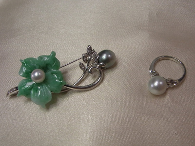 光の加減で修理前のパールの色が見えづらいのですが「リングとブローチのパールを入れ替えたい」・・・とご来店いただきました。